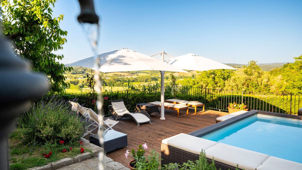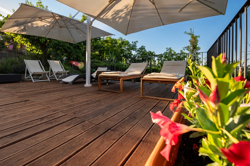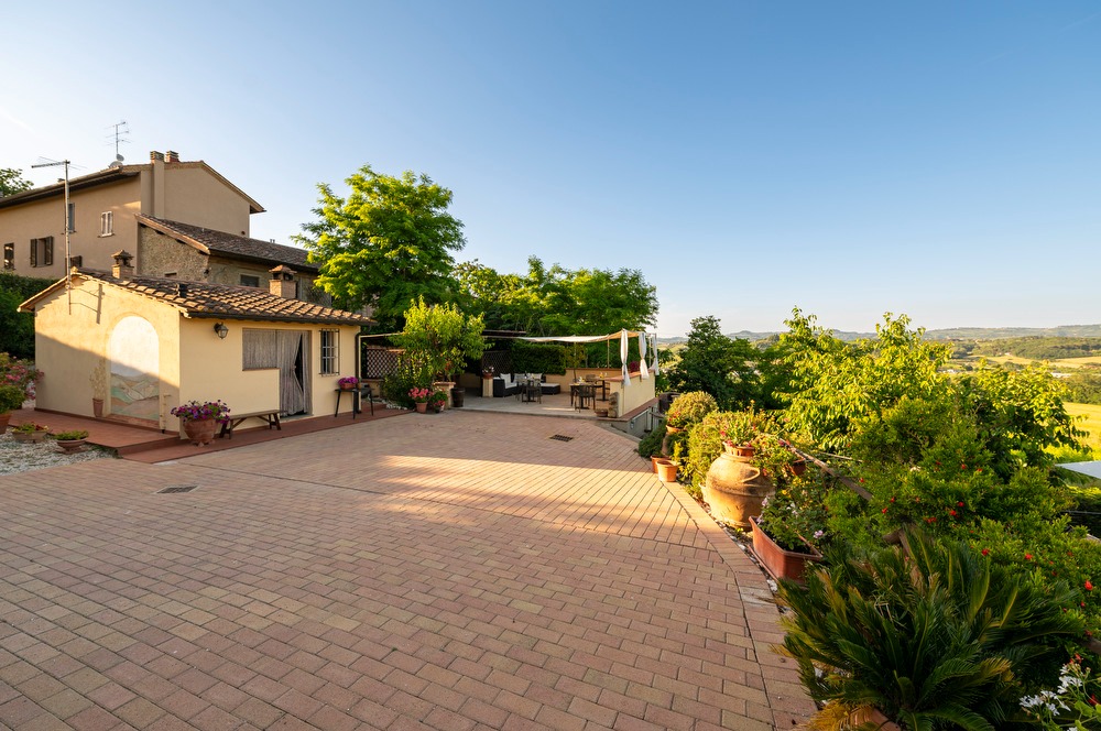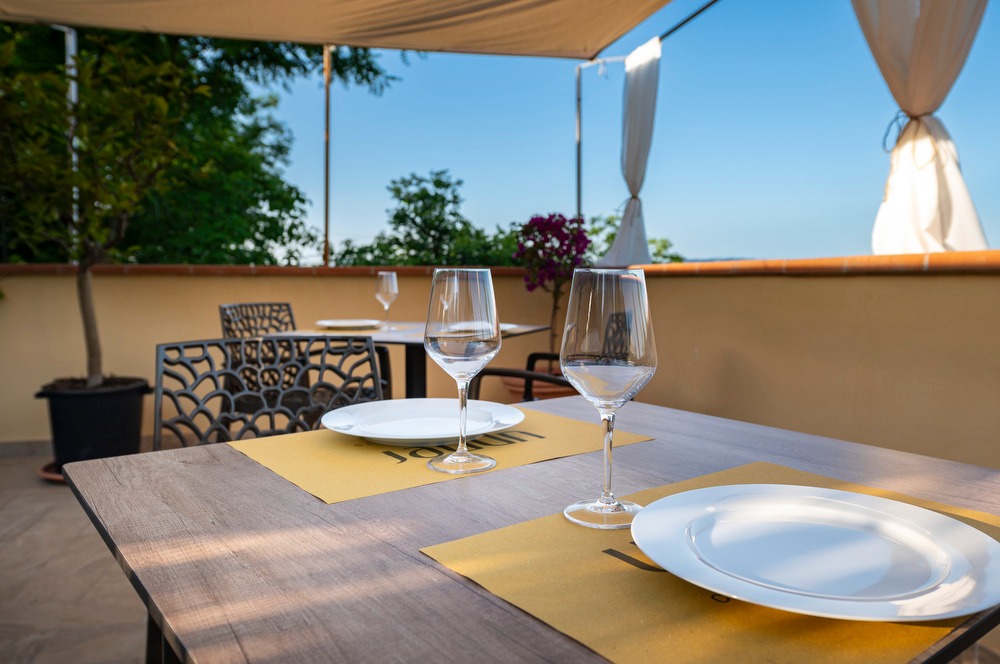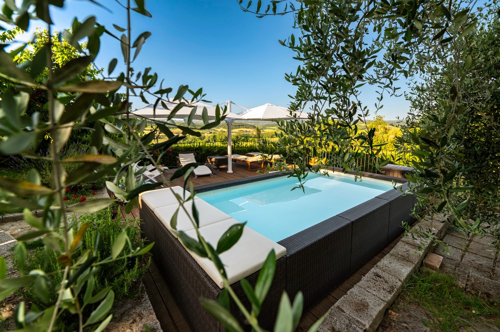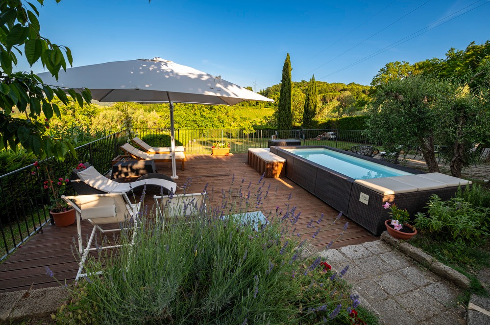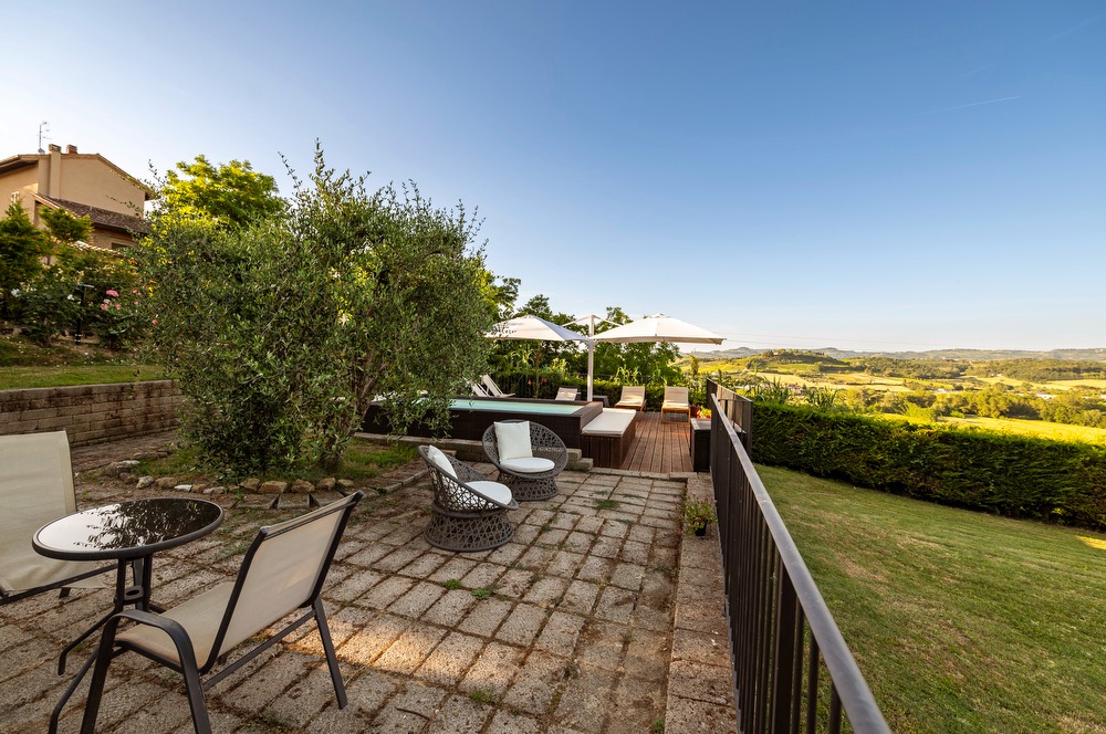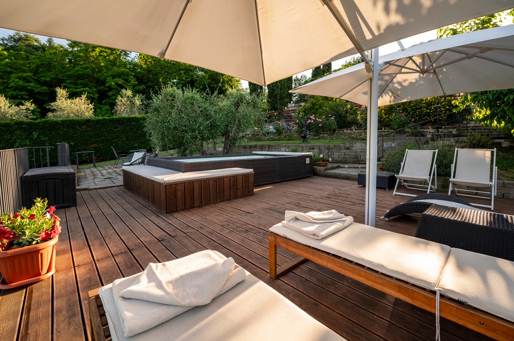 The highlight of this property is the private garden with a hot tub (available from May 1st to October 31st). The outdoor area is perfect for enjoying meals and breakfast outdoors, surrounded by a breathtaking view of the typical Tuscan landscapes, with its iconic vineyards and a lush green area. The property also boasts an open terrace, a covered terrace and a balcony equipped for barbecue.